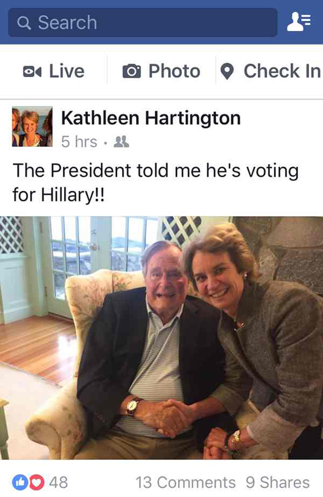 凯瑟琳前日在社交网站上载与老布什的合照,并兴奋地写道:总统告诉我他会投给希拉里!凯瑟琳其后受访时指,她在当日较早时间到缅因州与老布什会面,得知对方的投票意向。老布什的发言人回应时表示,老布什将于50多天后以普通公民的身份投票,他不会在选举过程中作任何评论。