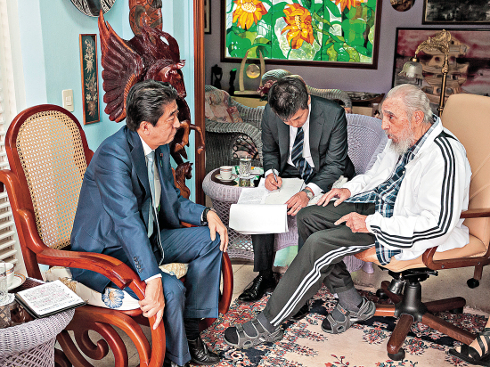 在美国纽约出席第71届联合国大会之后,安倍飞抵哈瓦那,先后会晤了古巴前领导人菲德尔•卡斯特罗和现任领导人劳尔•卡斯特罗。古巴官方报章《格拉玛》在安倍抵达前夕发表对其专访中指出,日本将持续强化对古巴经济与社会的发展。安倍抵达时强调,我期望能和古巴在公共与私营领域加强合作,希望我的访问能开启两国友好的新篇章。