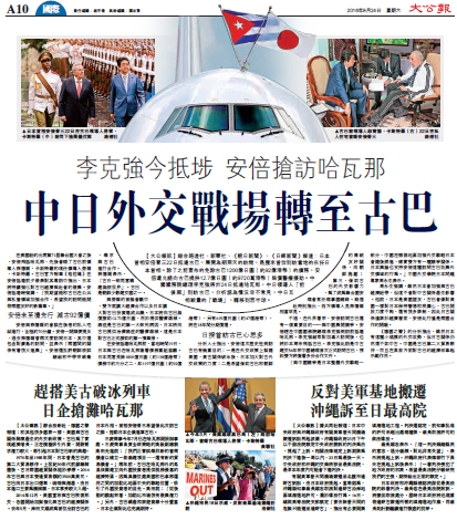 大公网9月24日讯 综合路透社、新华社、《朝日新闻》、《日经新闻》、德国之声报道,日本首相安倍晋三22日抵达古巴,展开为期两天的访问,是历来首位到访当地的在任日本首相。除了之前宣布的免除古巴1200亿日圆(约92亿港币)的债务,安倍还允诺向古巴提供12.7亿日圆(约9720万港币)无偿医疗援助。中国国务院总理李克强将于24日抵达哈瓦那,中日领导人前后脚到访古巴,分析认为情况并不常见,中日互相较量的战场,转移到西半球。