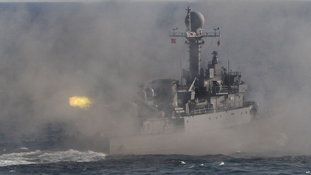 图:韩国巡逻船在军演中发射炮弹资料图片