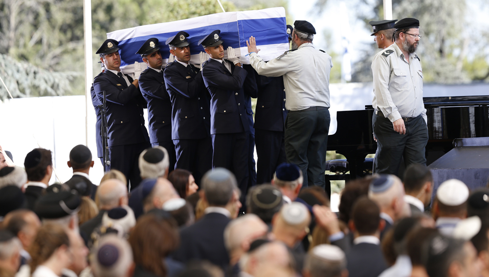 图:卫兵将佩雷斯灵柩送上赫茨尔山国家公墓/美联社