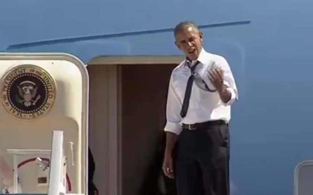 美国第44任总统奥巴马站在机舱门口,当时空军一号已启动发动机准备起飞,他捲起袖子,看起来显得焦虑。