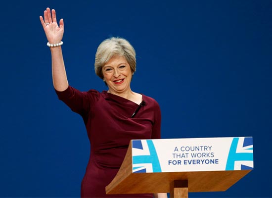 图:英国首相文翠珊5日在保守党年会闭幕会议上讲话\路透社