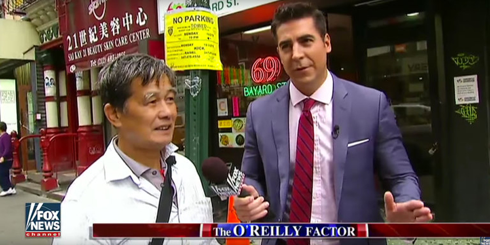 在非裔美国人怂恿对华人区住宅进行抢劫的音乐视频被华人社区抗议并成功从YouTube上撤下之后。Fox新闻台的节目《奥莱利实情》中新闻记者沃特斯在纽约几个华埠社区进行了采访。节目本身是为了对中美关系以及总统竞选等内容进行采访,但是实际采访的内容却包含了众多对华裔的刻板的、充满偏见的、种族歧视意味的内容。