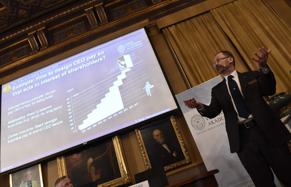 图:诺贝尔经济学奖评奖委员会会长向大家解释何为契约理论/法新社
