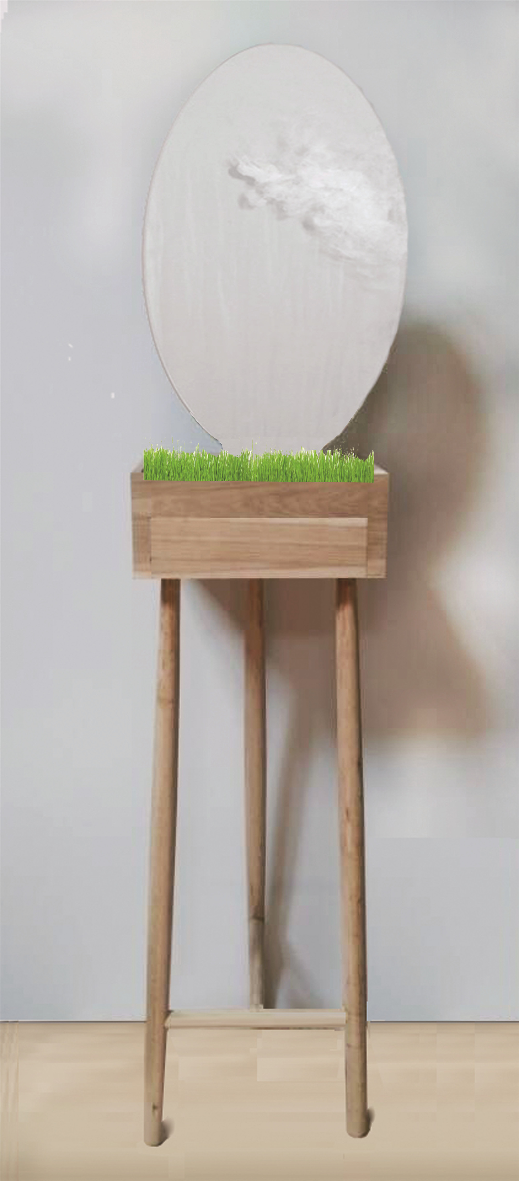 我设计的方案是绿植与家具结合。不仅发挥绿植的作用,还能缓解视觉疲劳放松心情。方案中有桌子与绿植的结合,净化空气还有滤水的作用,也有接镜子上掉下的水,也可以接雨伞的水,和有绿植的猫架。