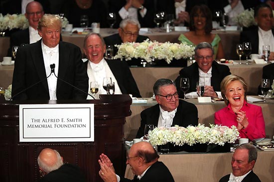 当晚极有可能是特朗普和希拉里在大选投票前的最后一次同台,二人仅隔着纽约红衣主教多兰相邻而坐,在对方拿自己开涮时都保持了笑容。