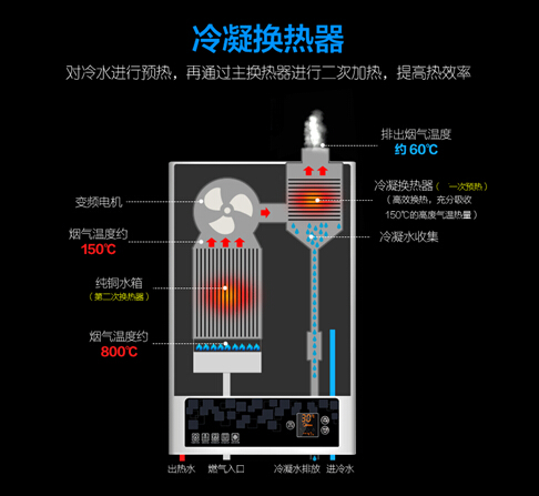 1.冷凝转换器,对冷水进行预热,在通过主换热器进行二次加热,提高热效率;