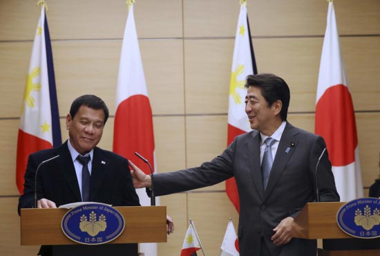 菲律宾总统杜特尔特(左)26日在东京与日本首相安倍晋三召开记者会。美联社