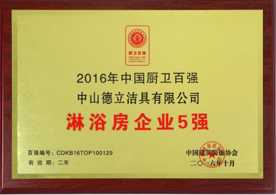 2016年10月27日,由中国建筑装饰协会主办,中国建筑装饰协会厨卫工程委员会联合广东省橱柜业商会共同承办,以“升级突破,持‘质’以恒”为主题的2016中国厨卫年会在广东中山顺利举行。会议中,新一届“中国厨卫百强企业”荣耀诞生。德立淋浴房(淋浴房装修效果图)再度荣誉加冕,凭借创新的产品设计、精湛工艺以及雄厚品牌实力荣获“中国厨卫百强”,并连续蝉联“淋浴房企业5强”榜首。