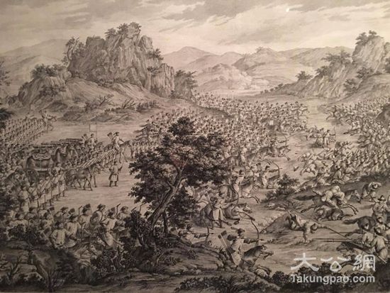 纽约大都会博物馆的中国书画展厅近日开始推出《图示和言传:说故事的中国画》特展。此为郎世宁等人绘图,巴黎皇家作坊刻印制作的一套16幅的铜版画,反应的是乾隆在1755到1759年间平定西北边陲准噶尔和回部的战役。大公报记者 黄晓敏摄