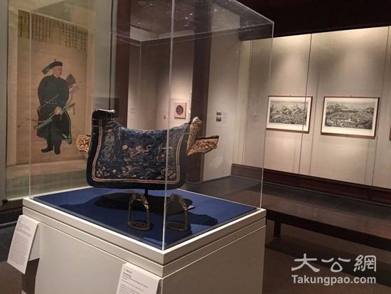 刘晞仪还独具匠心地从大都会博物馆的其他部门借来了清军将领的佩剑、马鞍、官翎等实物展品,以配合展出乾隆皇帝请当时在清宫的传教士郎世宁等人绘图,并送到巴黎皇家作坊刻印制作的一套16幅的铜版画,反应的是乾隆在1755到1759年间平定西北边陲准噶尔和回部的战役。