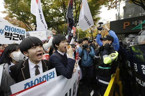 在涉嫌接受崔顺实女儿违规入学的梨花女大,40多名教授和2500多名在校生、毕业生,身穿象征梨大的绿色服装在校内游行,要求解放梨花、铲除腐败、严惩崔顺实事件责任人等。