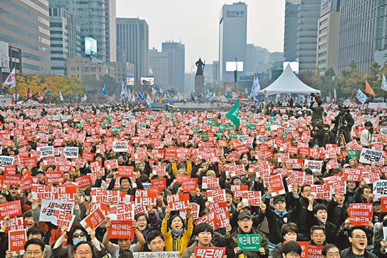大公网11月6日讯 综合韩联社、法新社、韩国《朝鲜日报》网站报道:韩国民众及多个市民团体五日在首尔举行大规模集会,抗议闺密门干政事件,要求总统朴槿惠负责。主办方指今次集会有近20万名民众参加,成为自2008年反对美国牛肉进口以来,韩国人数最多的示威之一。