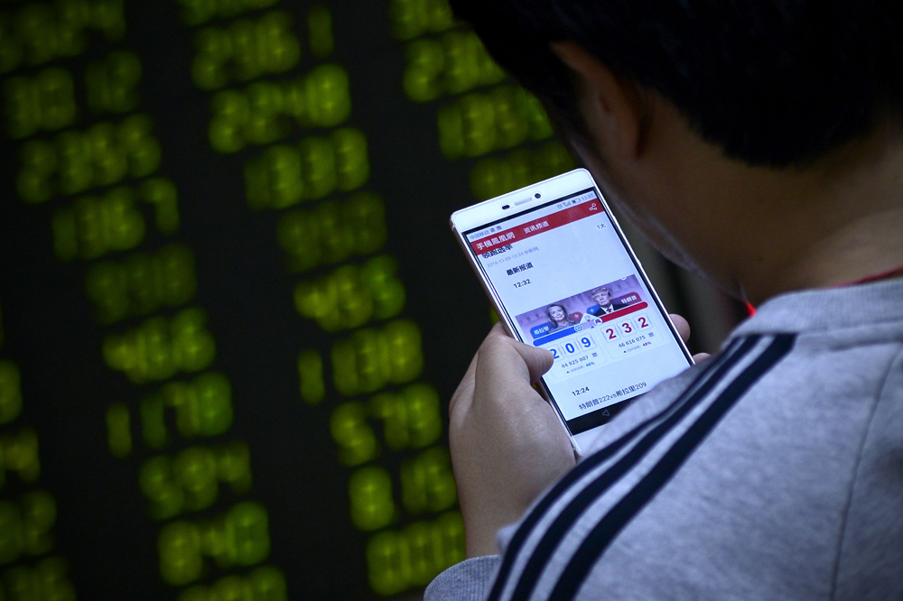 一名上海市民在证券交易所查看美国大选新闻/美联社