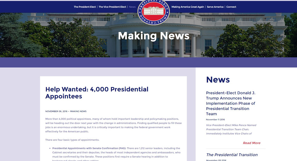 美国法律对总统交接事宜有详细规定,起源于1963年的总统交接法,而特朗普作为总统当选人,也已有由美国官方主导、联邦政府出资且将列入政府档案的.GOV网站。