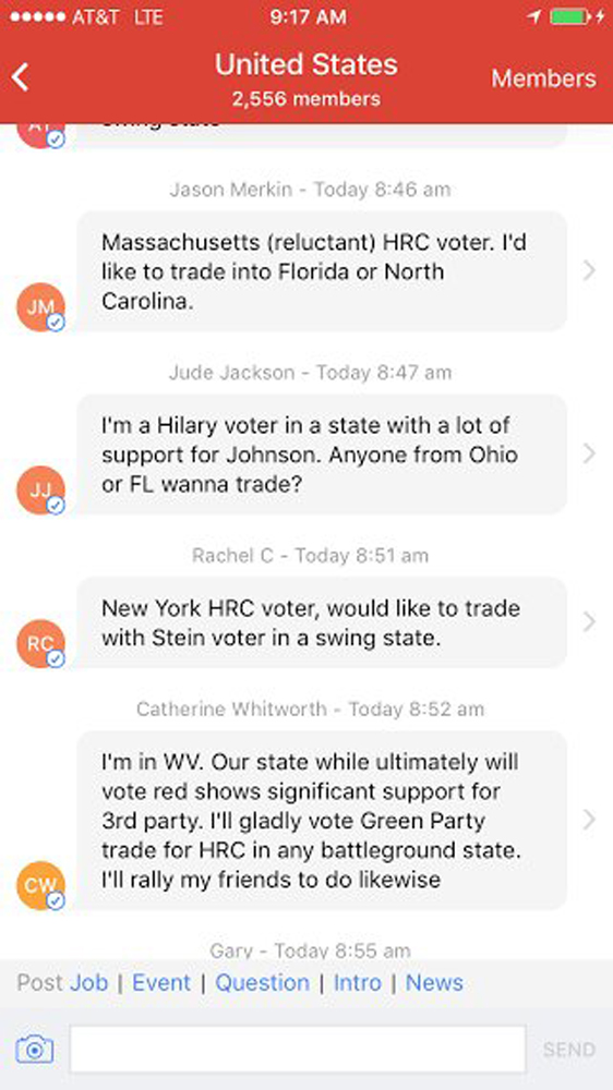 已有数以万计的选民在选举日前参与换票交易,大多数是在防堵特朗普当上总统。在大家无从证实选票是否依照协议投票下,不过有些人将在拍照合法的州与选票自拍。