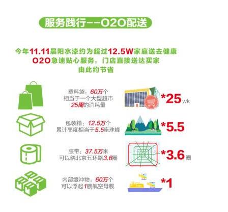 除了有着令人期待的环保产品,晨阳水漆在减少碳排放方面的贡献还体现在其优质的配送模式。当产品销售从线下渐渐过渡到线上,大量产品的过度包装往往在无形间催生着“碳足迹”的增长,也加剧着地球的温室效应。但晨阳水漆则充分考虑到了这一问题,所以特别采用了O2O极速贴心服务,通过门店直接派送的形式大大降低了塑料袋、包装箱、胶带、内部缓冲物等包装材料的浪费,为减少“碳足迹”做着切实的努力。