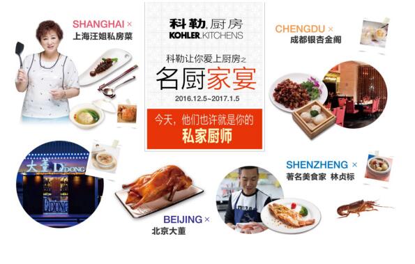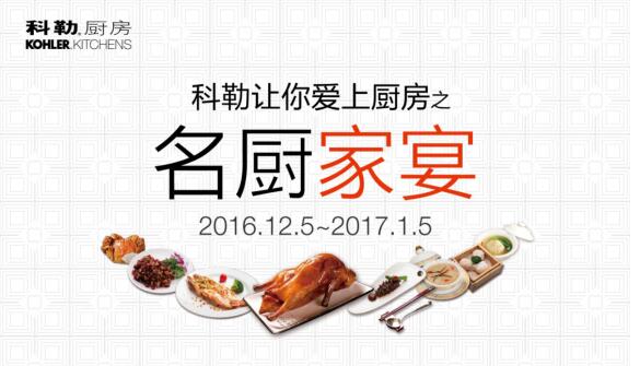 自2016.12.5起至2017.1.5,购买科勒厨房整套橱柜,就能在官方微信“科勒爱厨房”上报名参与“科勒厨房之名厨家宴”活动,获胜者将有机会邀请4-6位亲友享受名厨主持的上门豪华家宴。