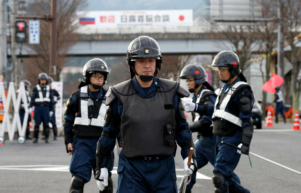 图:日本防暴警察在日俄首脑会会场附近驻守/路透社