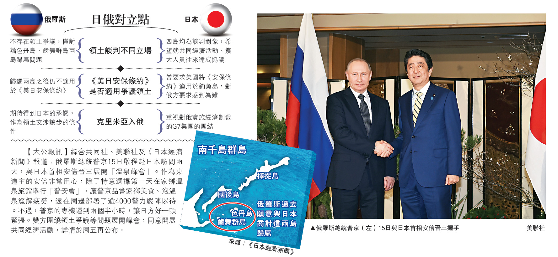 综合英国广播公司、《日本经济新闻》报道:日本首相安倍晋三希望趁俄罗斯总统普京这次到访日本,讨论如何解决争议岛屿南千岛群岛(日称北方四岛)的问题。在日俄以往的领土谈判,日本历代政府均提出过解决对策,但也屡遭挫折。