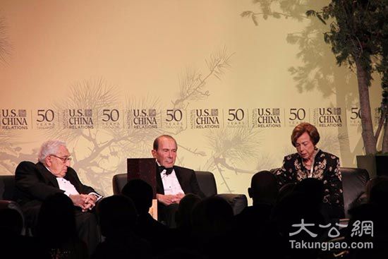 美中关系全国委员会12月15日在纽约举行成立五十周年庆祝晚宴。前美国国务卿基辛格(左)和美国国际集团前总裁莫里斯·格林伯格(中)被委员会授予终生成就奖(黄晓敏/摄)