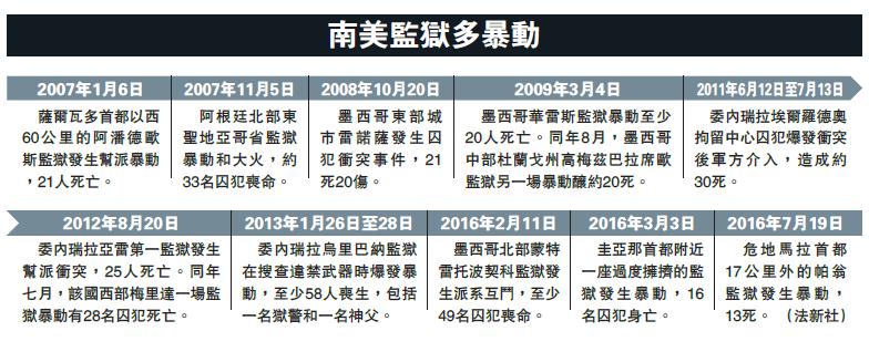 大公网1月4日讯 综合法新社、英国广播公司、《卫报》报道:2017年第一天,巴西就发生大型惨案。该国亚马逊州北部一监狱发生囚犯暴动,经过17小时后暴动趋于平息,但事件已造成56人死亡,其中至少有六人惨遭斩首,另有87名犯人越狱,其中40人已被抓回。虽然南美地区监狱治安一向堪忧,但此次事件是整个南美过去近二十年来最严重的一次监狱暴动事件。
