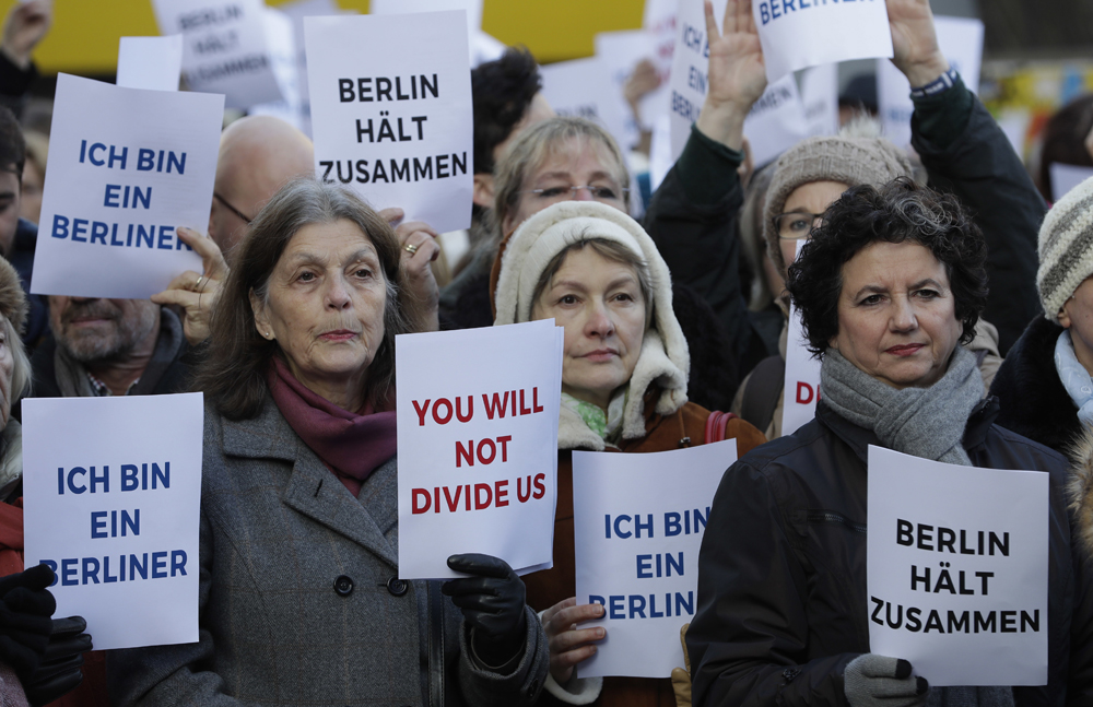 图:德国民众在柏林高举我是一个柏林人的标语牌 美联社