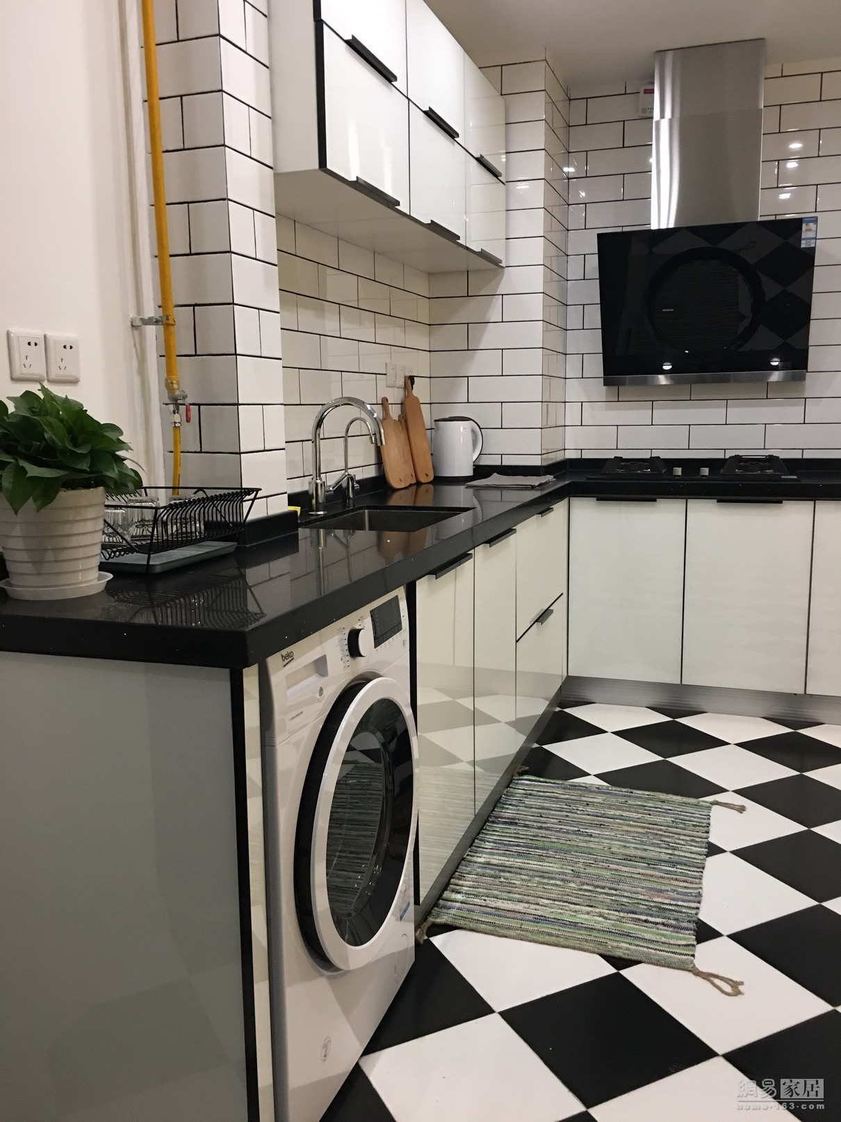 玄关空间较大,没有规整的做成一排柜子。网购淘的木架子错落有致地摆放着一些绿植,与整个房间的自然气质十分契合。大块黑白相间的地砖,使得一种低调的宁静感油然而生。比较遗憾的是没有选择白色烤漆面的热水器,黄色的天然气管道没法移动和包装起来,在入户这个地方稍显简陋。