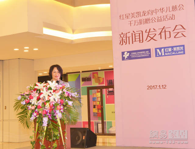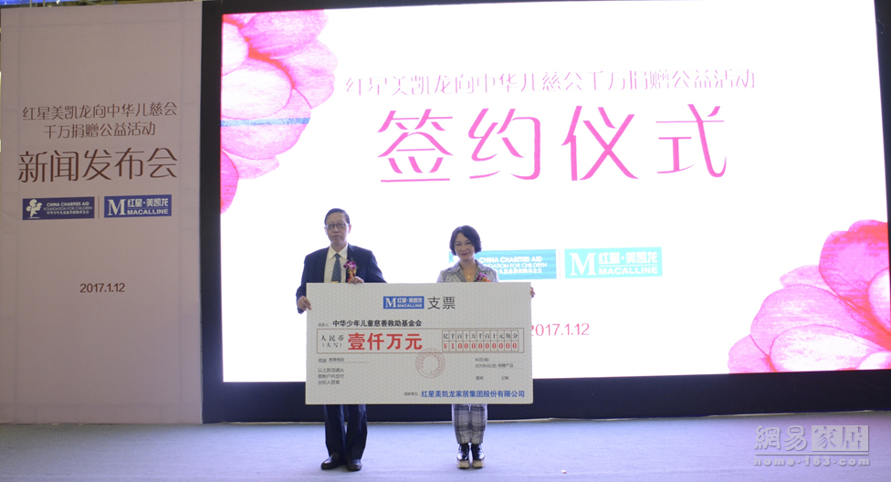 2017年1月12日,红星美凯龙捐赠公益活动新闻发布会在红星美凯龙北京东四环商场顺利举行。捐赠仪式上,红星美凯龙宣布向中华少年儿童慈善救助基金会(以下简称:中华儿慈会)捐赠近1000万元家居,共同助力中国困境儿童成长。