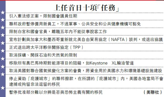 大公网1月21日讯 据路透社、法新社报道:美国候任总统特朗普的团队早前表示,新总统已做好准备,将在20日上任的第一天就开始采取行政措施,大刀阔斧地落实他的承诺,对移民进行限制、在美国与墨西哥边境建立高墙,并撤销其前任奥巴马推行的多项政策。