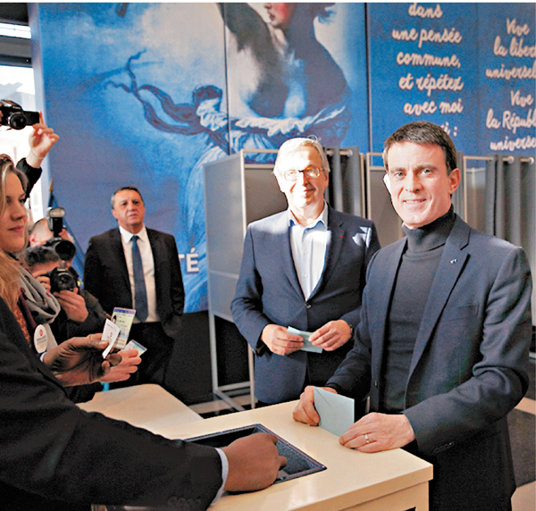 蒙特布格在经济方面主张法国优先,他昨日投票时称,希望结合所有左翼力量,赢得大选。哈莫的政纲包括主张向所有成年国民,提供750欧元(约6,226港元)基本收入。