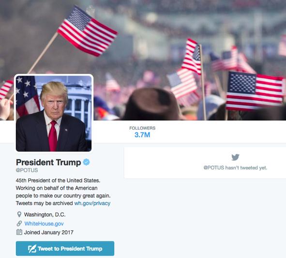 特朗普的@POTUS帐号一经启用,一小时内就吸引到430万名粉丝关注。特朗普原来的帐号@realDonaldTrump拥有两千万粉丝,他将同时使用这两个推特帐号。但目前不清楚特朗普将如何使用他的新帐号,以及是否由他的助理帮助发推文。