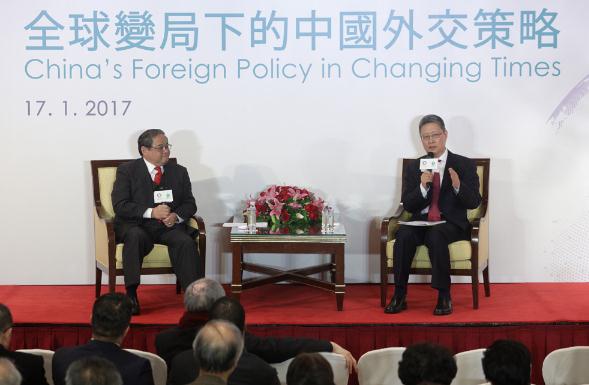 图:前外交部副部长何亚非(右)应团结香港基金邀请,昨在港演讲题目为全球变局下的中国外交策略\大公报记者林少权摄