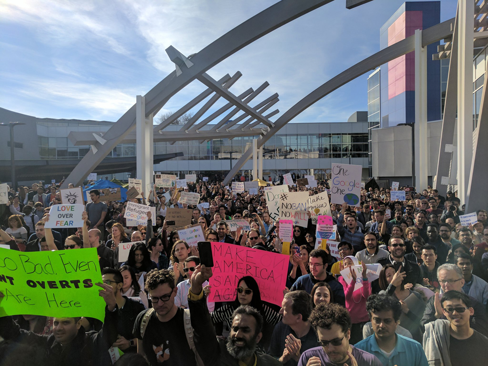 图:Google员工周二在加州总部集会反对移民禁令\网上图片