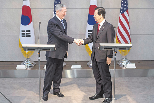 韩国国防部指,马蒂斯在会上重申美国对盟友韩国的协防承诺,优先处理朝鲜核威胁问题,并会采取防御措施保护韩国人民及驻韩美军。马蒂斯与韩民求会谈期间,就朝鲜去年核试及试射导弹交换意见,评估相关安全风险,双方一致认为韩国保持有力的协防措施至关重要,因此美国决定为韩国提供延伸威慑力,如期在今年内于韩国部署萨德导弹防御系统,并已商讨具体日程。韩国防部强调,部署萨德系统只是针对朝鲜的导弹威胁,无意针对其他地区。