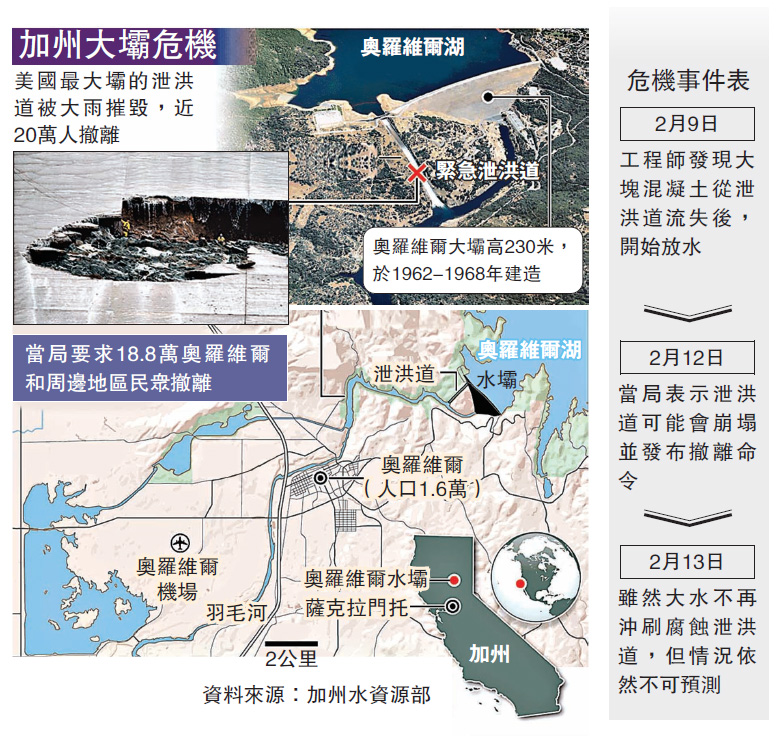 奥罗维尔大坝建成于1967年,高230米,为美国最高,奥罗维尔湖是加州第二大人造湖,是加州主要水源地。美国北加州原本多年来饱受乾旱,却从1月20日起连日遭逢大雨,大坝蓄水量从八成增到满溢,成为48年来最满的一次,由于主泄洪道出现一条长60米、深及9米的巨大缺口,流出的洪水不断沖刷土石,相关人员担心水坝溃堤,9日起开闢一条紧急泄洪道,至11日上午八时仍不断排水。