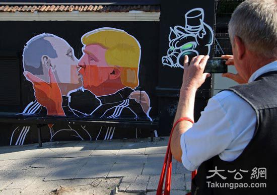 当地时间2016年5月13日,立陶宛维尔纽斯一家饭店的墙上出现时任美国总统候选人唐纳德·特朗普与俄罗斯总统普京拥吻的涂鸦。图片来源网络