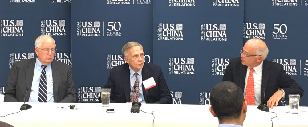 图:美中关系全国委员会21日在纽约举行座谈会,美前驻华大使罗德(中)以及前驻华大使芮效俭(左)出席 黄晓敏摄
