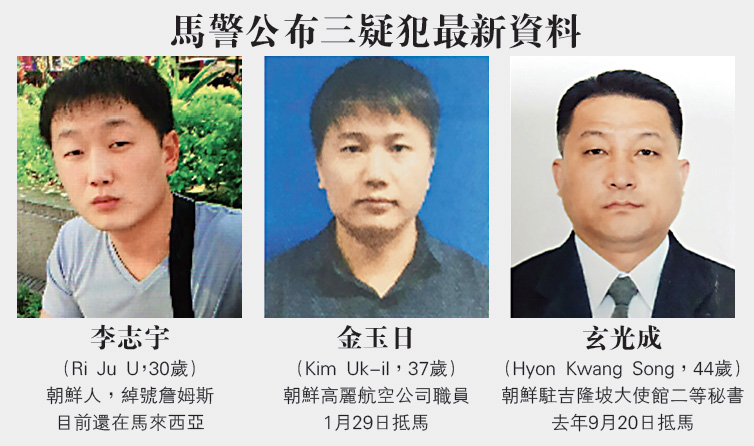 马来西亚警察总长哈立德22日亲自主持金正男命案记者会。除了已经宣布身份的疑犯外,大马警方表示,正在搜寻另外两名朝鲜籍嫌疑人,分别是朝鲜驻马来西亚大使馆二等秘书的玄光成(Hyon Kwang Song)和朝鲜高丽航空公司职员金玉日(Kim Uk-il)。另外,还有一名英文名为詹姆斯(James)的朝鲜疑犯李志宇(Ri Ju U)下落未明。