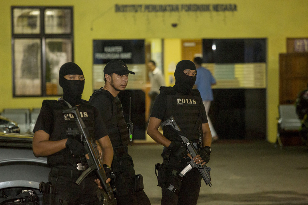 图:大马特种部队21日在存放金正男遗体的中央医院太平间外驻守/美联社