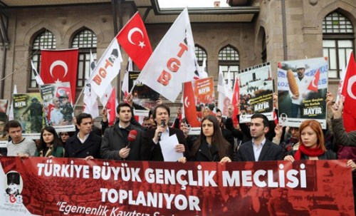 近日,该河山耳其青年会的一批正在安卡拉的大厦外面会议,号令选平易近正在本年4月16日的全平易近中对扩大总统投否决票。