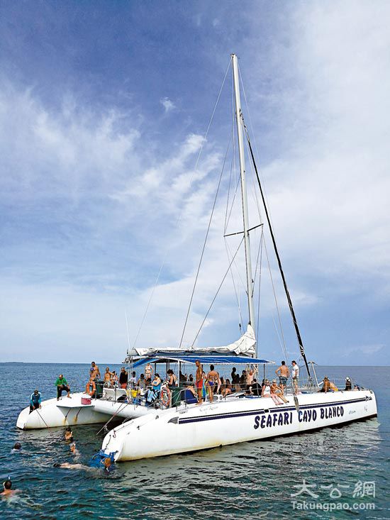 强烈推介双体风帆专案,我采办的是特价日,每人85CUC,原价110CUC,包午餐,酒水任饮。早上主旅店出发,十五分钟车程到船埠,一艘艘富丽的双体风帆停泊正在岸边,浩繁来自世界各地的旅客鱼贯上船,次序井然,咱们乘站一艘载客一百人的大船,同船大部门是战欧洲人,只要八个中国人,都是来自的喷鼻港人。