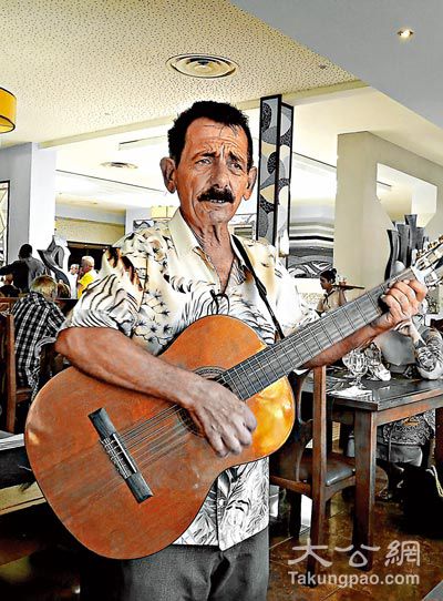 沧桑的老歌手为餐厅的客人献唱,别忘给小费啊。作者供图