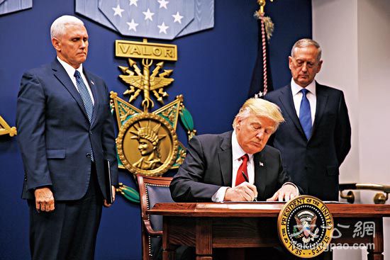 美国总统特朗普(中)6日签订新的旅行。材料图
