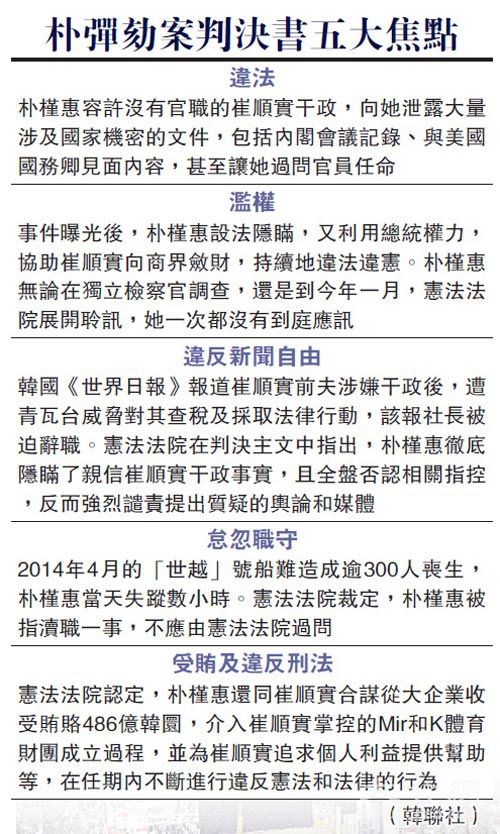 本港时间10日上午,韩国法院代院幼李贞美用了廿多分钟正在天下直播中讯断书,她指出,加入案最终表决的8名全数投同意票,赞成撤职总统。法院称,尽管提出的部门不建立,但干政等大部门建立,且足以成为撤职来由。