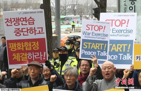 3月7日,韩国正在美国驻韩国大前举行反战会议,韩美举行结合军事演习。中新社
