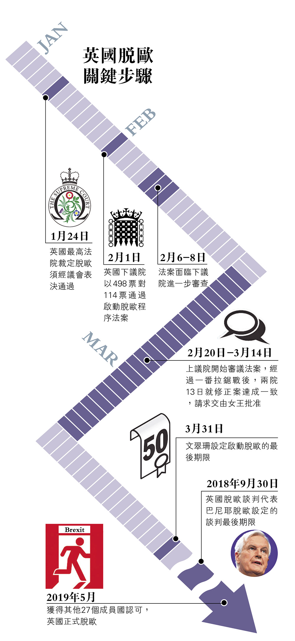 至公网3月15日讯(至公网驻伦敦记者 李 威)英国议会战13日先后通过脱欧法案,为启动脱欧扫清妨碍。辅弼文翠珊只需再获英女王御准,即可通知欧盟,英国启动《公约》第50条,展开为期两年的构战。文翠珊料周二要求觐见女王。