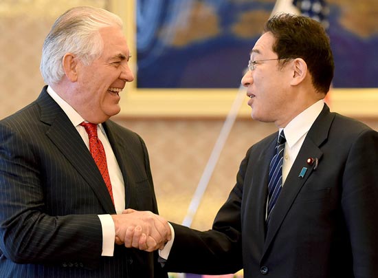 美国国务卿蒂勒森(右)16日正在东京会晤日本皮毛岸田文雄。透社