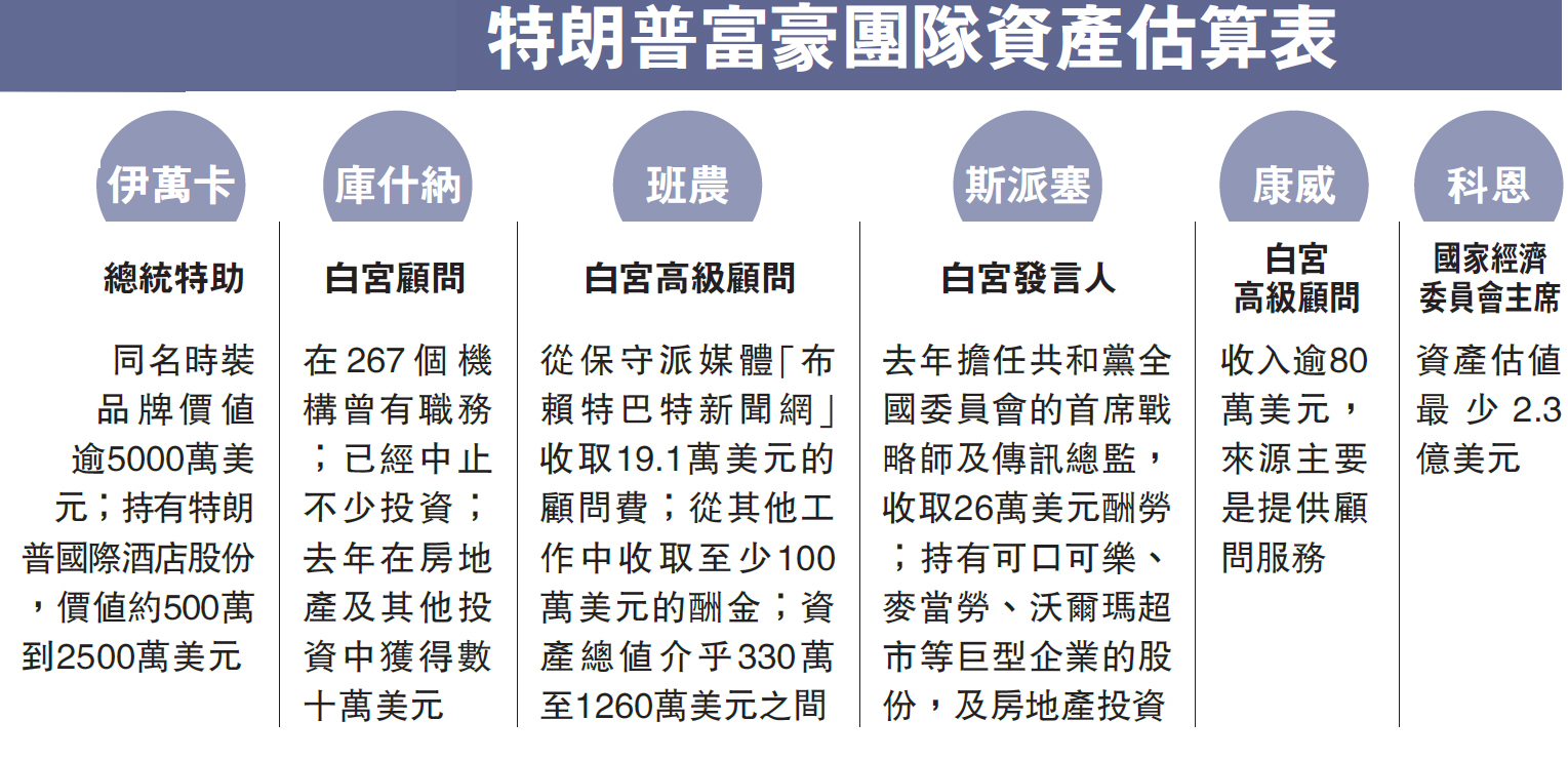 除了第一女儿家庭,另一亮点是白宫国度经济委员会从席、前高盛集团总裁科恩,其资产估值起码有2.3亿美元。但他正在各项资产数字都只填写了逾1亿。